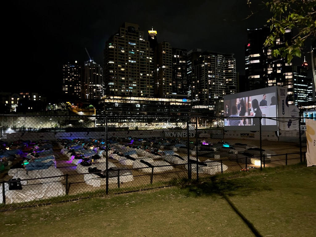 As we strolled to the Barangaroo Metro Station we passed an amazing sight. Rows of people were lying on mattresses watching an outdoor movie. It was the premises of “Move’in Bed”.