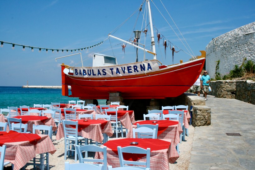 After a walk through the maze of streets we passed through to the other side of the town where we saw a row of windmills. Now no longer in use as windmills, some are private residences and shops. John was surprised at all the shops and cafes. They were all private homes with families when he was here last. In the past some had rooms to rent but the ubiquitous display of postcards, souvenirs and T-shirts showed how much the island had changed.